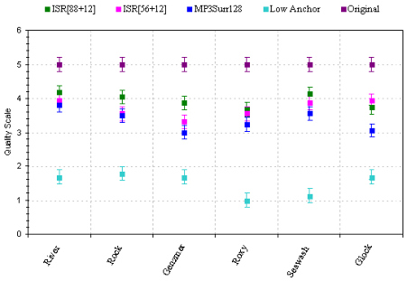 In the second test ISR shows significant gains in terms of quality compared to recently standardized MPEG Surround. In these tests core codec for ISR and MPEG Surround was replaced with original audio as input. The below figure shows the subjective score: